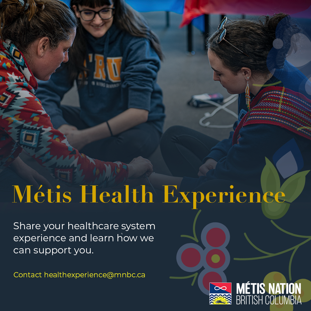 Navigating the health care system can often be overwhelming, especially if you or someone you know is facing health challenges. The Métis Health Experience Program assists Métis individuals, families, and communities across BC to navigate the healthcare feedback process. The program provides a safe space for Métis-led conversations around all types of health experiences and advocates for change, through story sharing and ensuring Métis are being represented in health.