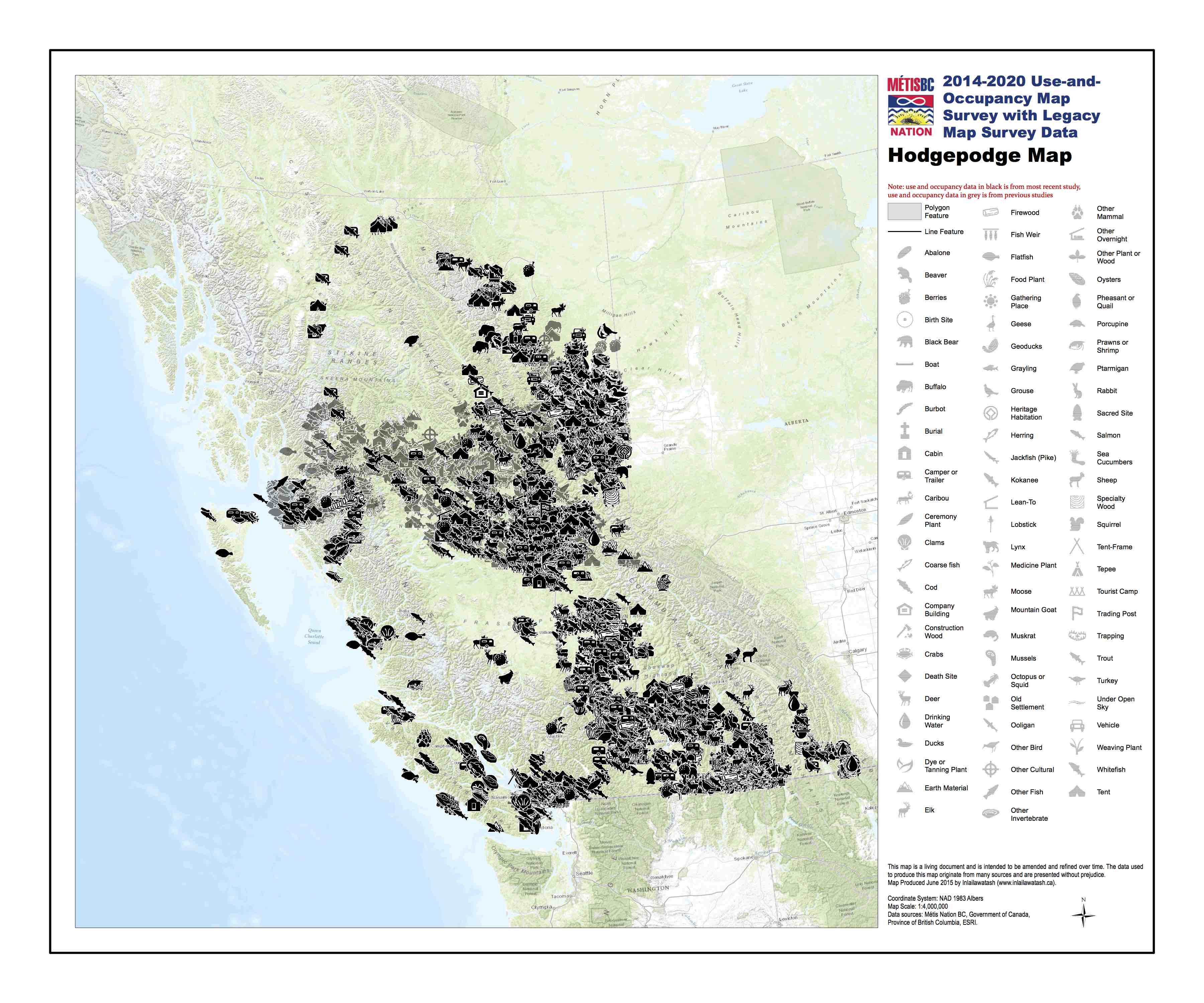 The following Hodgepodge map is incomplete, as we have not interviewed all Métis harvesters in BC, but demonstrates strong Metis land use within the province.